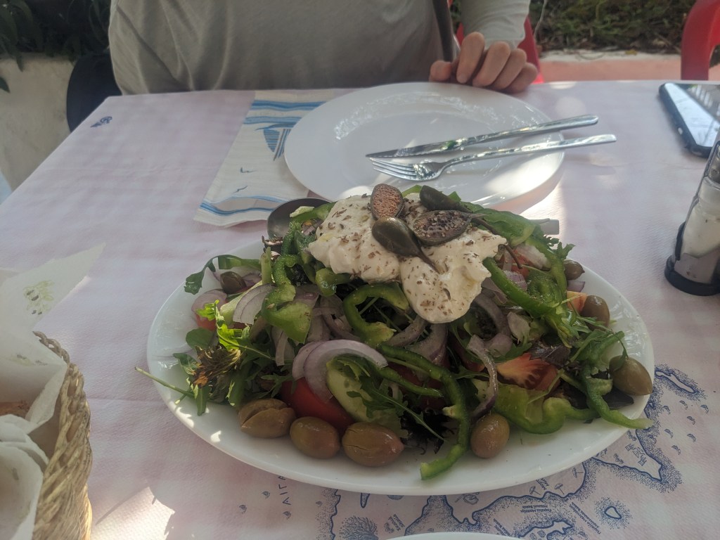 When we were done at our hidden paradise, we called our captain and asked him to come back. Since he can’t charge us a taxi fee since he’s not licensed, the boat ride is free…as long as you eat in his restaurant! I had an excellent salad with the bread rusks and caper berries (a new food for me!), plus fresh OJ.
