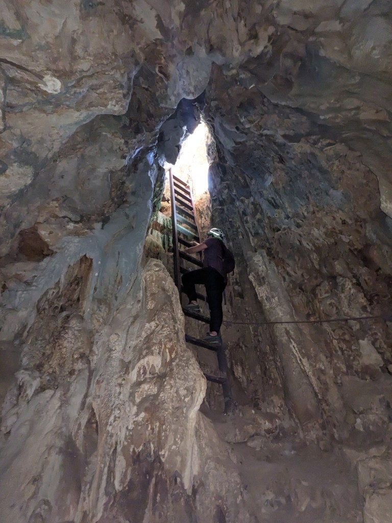Once done climbing, we walked in town, bought chalk, stickers, a t-shirt, and lemon soda, then came to swim at our little private shore with our new floaty. The water and weather was a tad bit chilly, but it was still idyllic. We hopped in our pool to warm up and then went to see Skalia Cave, which was a 10 minute hike to the base of the rock band and then a spooky but gigantic cave filled with tufa (a type of porous rock all over the climbs here), stalactites, and HUGE spiders Jordan claims were as big as my palm. I tried not to look for them. It was very neat down there, but sweaty, humid, and dark. We descended 2 ladders and held onto a piece of rope to descend more, but it still kept going after we declared ourselves done. Yipes!