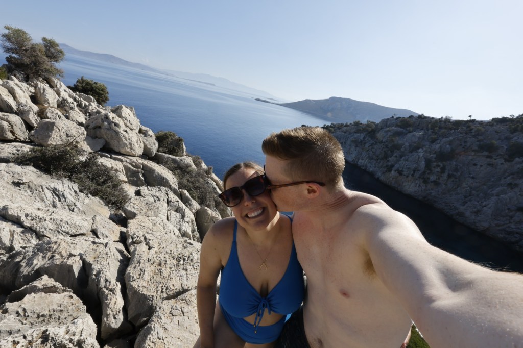 We each sent our hardest pitches yet, a 5C and 6C! Pretty good for a rest day! Then we swam in the cove, just missing the dolphins that some kayakers had seen on their way in, and hiked to the top of the rock outcropping for views of some other small islands and the west coast of Turkey. J’s phone even displayed Turkey’s time zone!