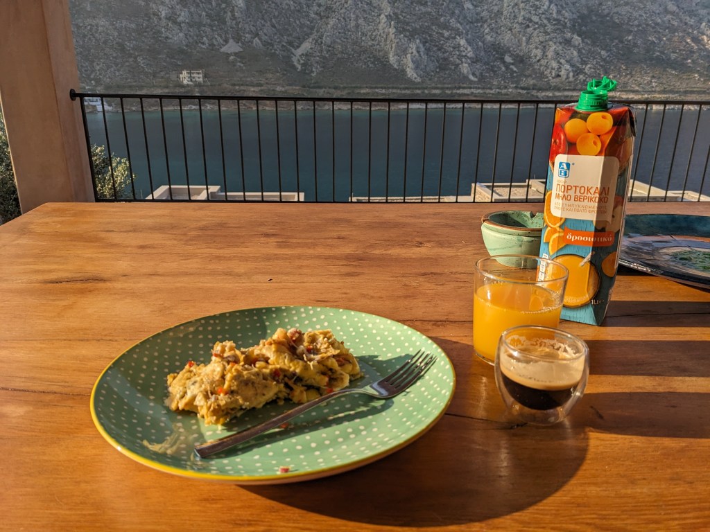 It started raining right as we left the wall, and we hung out at the villa in the drizzle. I bought an onion from the travelling vegetable man for 40 cents, and the guy at the mini mart gave us his wife’s homemade hummus when we checked out. We learned the other day from the Canadian couple we climbed with that some Greeks still believe in the idea that any one of us could be a god – random kind deeds could be beneficial just in case one accidentally gives hummus to a goddess. For dinner we had grilled veg, grilled pita with hummus, and grilled onion with olives, crackers, leftover pasta, cookies…we feasted!