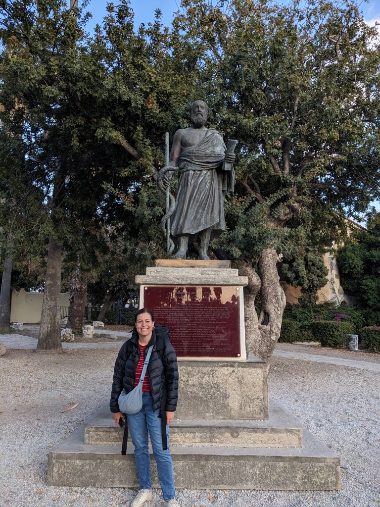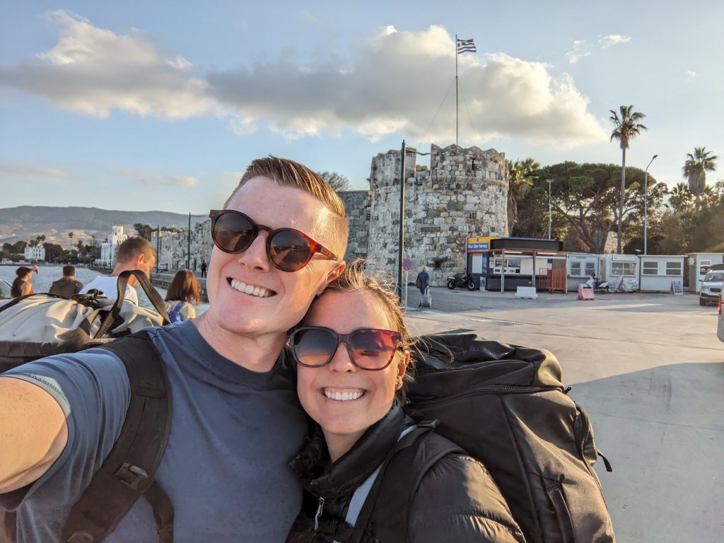 Friday night we took our car back – easy – and got on a bigger ferry to Kos town. We sat on the top deck and looked at all the little islands and Turkey on the way over. In Kos things were mostly shut down for the season but we were able to see the plane tree where Hippocrates taught his medical students (or at least one of the tree’s descendants), the outside of a byzantine castle, a beautiful harbor, and a restaurant that we hung out in near some old Greek ruins, which happen to be everywhere. The restauranteur was fascinated by us, and asked a lot of questions about where we were from.