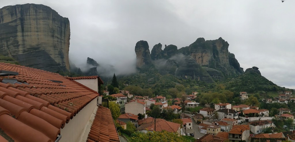 We drove a few more hours to Meteora, a town with a random outcropping of huge natural stone pillars that monks built monasteries on top of starting in the 11th century. The geology itself is super cool, and then there are amazing cloisters perched on top of each tower; it’s mind-boggling and really pretty. We did a bit of a scenic drive around the pillars and got a fantastic view for photos before the fog rolled in.