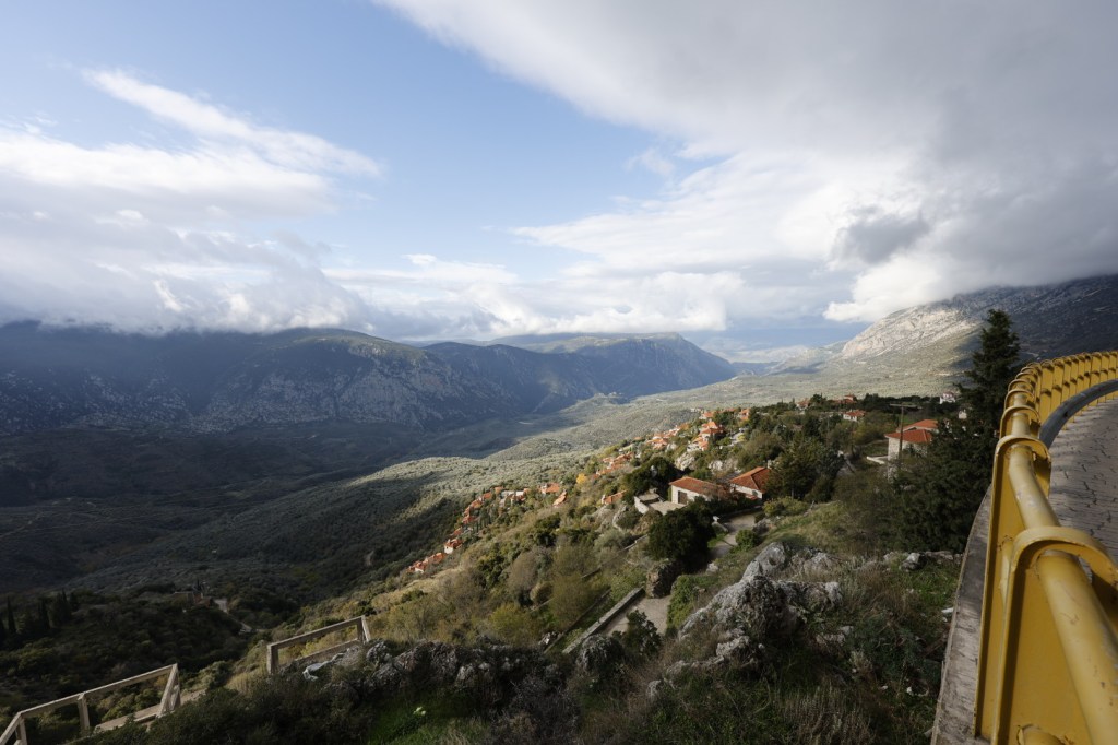 On Saturday we woke to gorgeous lightning and cotton candy skies, under which we drove about three hours to Delphi. The landscape here on mainland Greece is beautiful; there are knolls and limestone mountains everywhere, pretty farms and olive groves, excellent toll highways, normal drivers, and little coffee houses to stop in everywhere. Each coffee house has a group of retirement-age men hanging out on the porch. We stopped briefly in a town called Arachova just because it was so mind-numbingly pretty; the view was of Mount Parnassus and the town’s vibe was a mix of Dolomitian ski town and Italian hill town with little alleys filled with cats. We’d love to return here to ski!