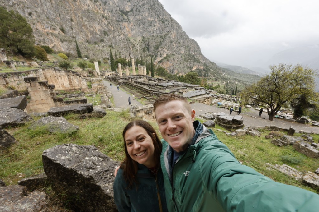 A bit down the road we finally came to Delphi: home of the ancient “oracle” and at one point considered the center, or “navel” of the world. It’s filled with a sanctuary dedicated to the god Apollo, a 5,000 seat theater, and a stadium where they held games similar to the Olympics but including a singing competition held in the theater. The museum had many of the partially preserved friezes and statues that visitors would erect for Apollo and the oracles. From what we could gather it sounds like the oracles were ladies who got high on fumes that came out of fumaroles/smoked oleander and spoke in tongues; priests would then “translate” the oracles words into a riddle-like answer for the question a visitor asked. Because people came from all over the known world to get their questions answered here in Delphi, the priests actually had a lot of information and context for current events. Some of their advice was probably pretty good! We loved the view from up on the hill tucked against the huge limestone walls, and in the rain everything was quite atmospheric and mystical.
